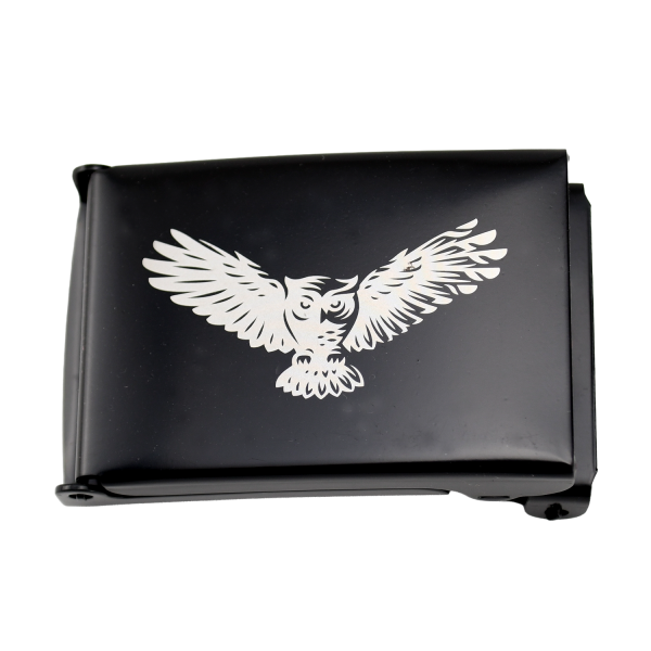 Black military belt buckle for 1.25″ webbing – laser engraved: owl in flight